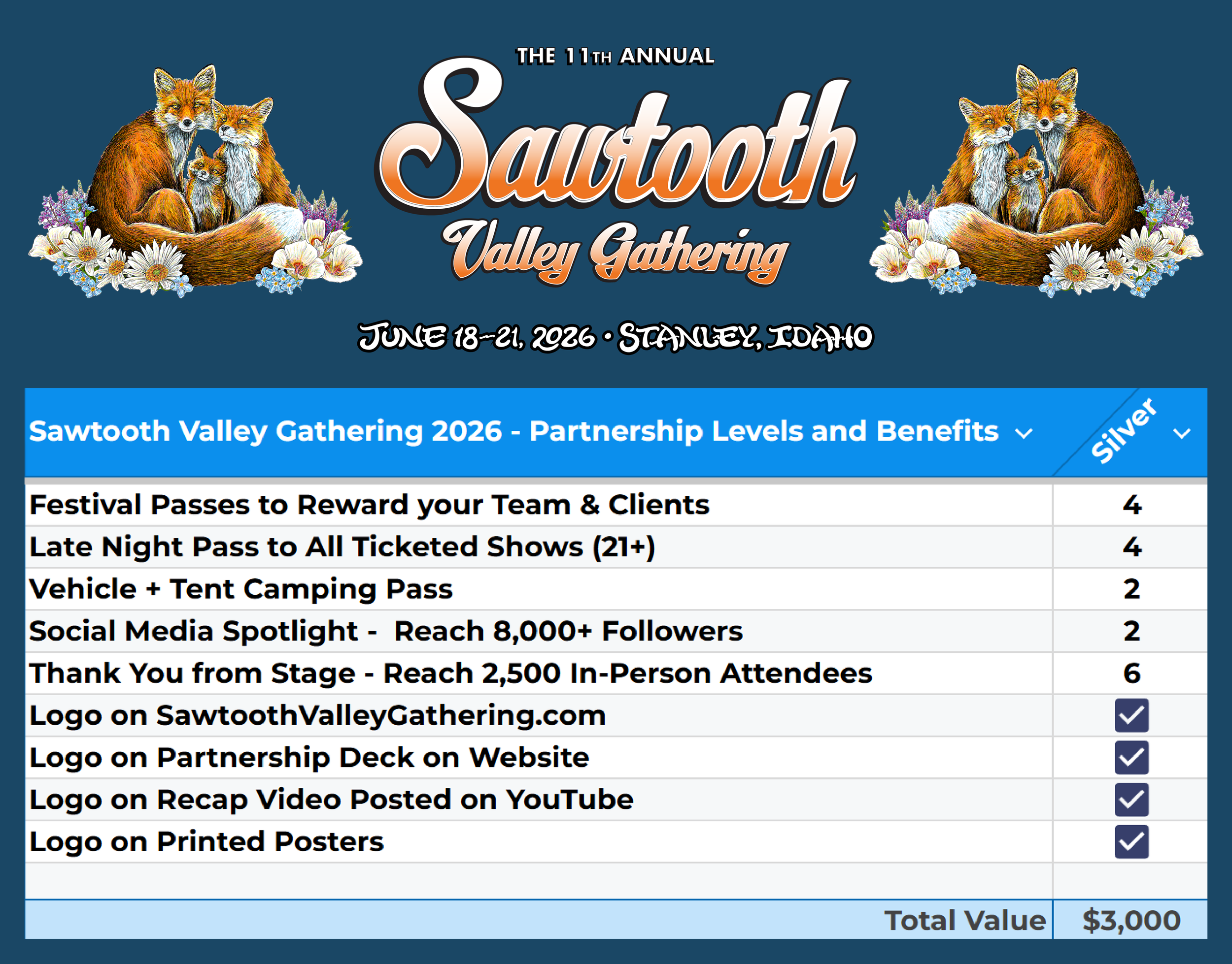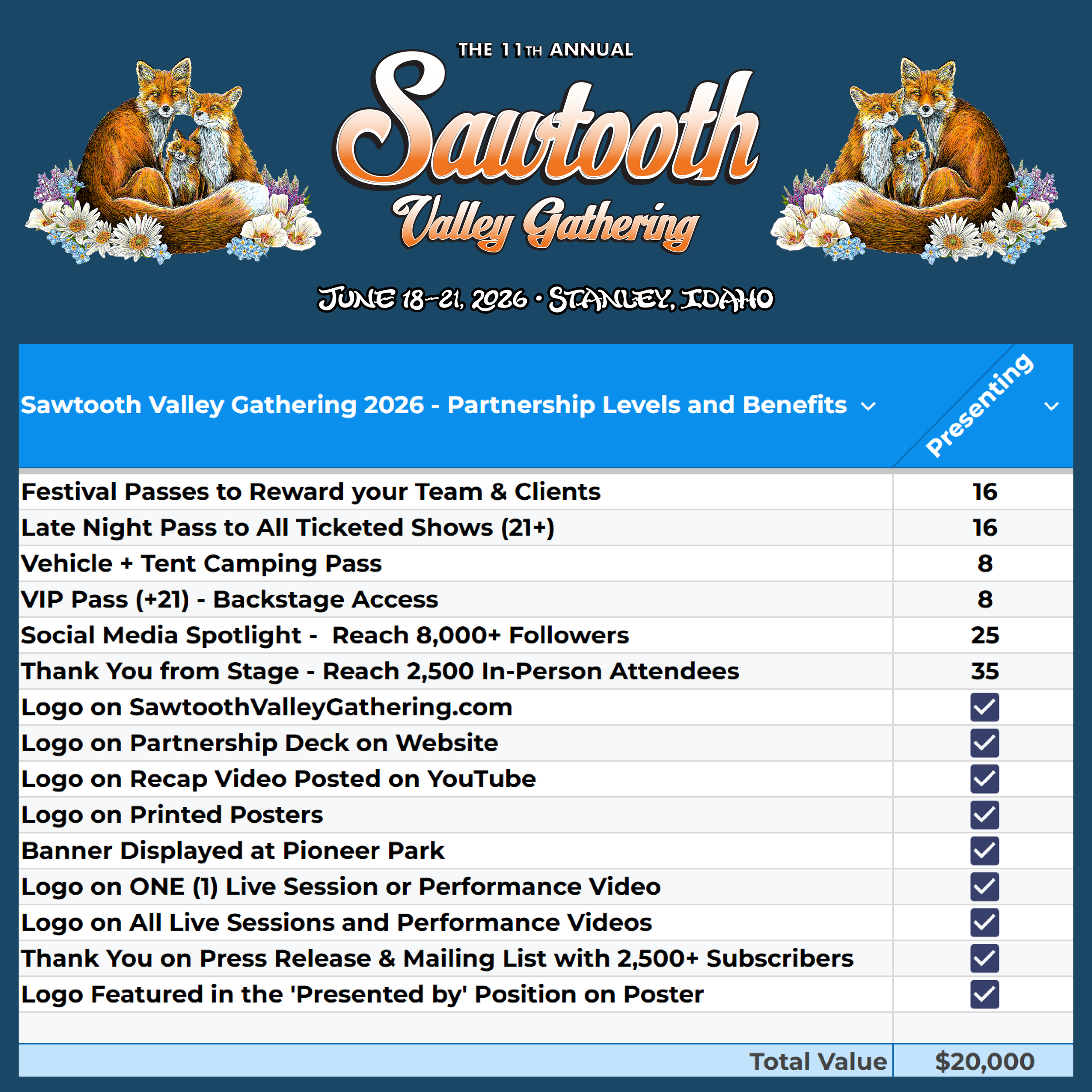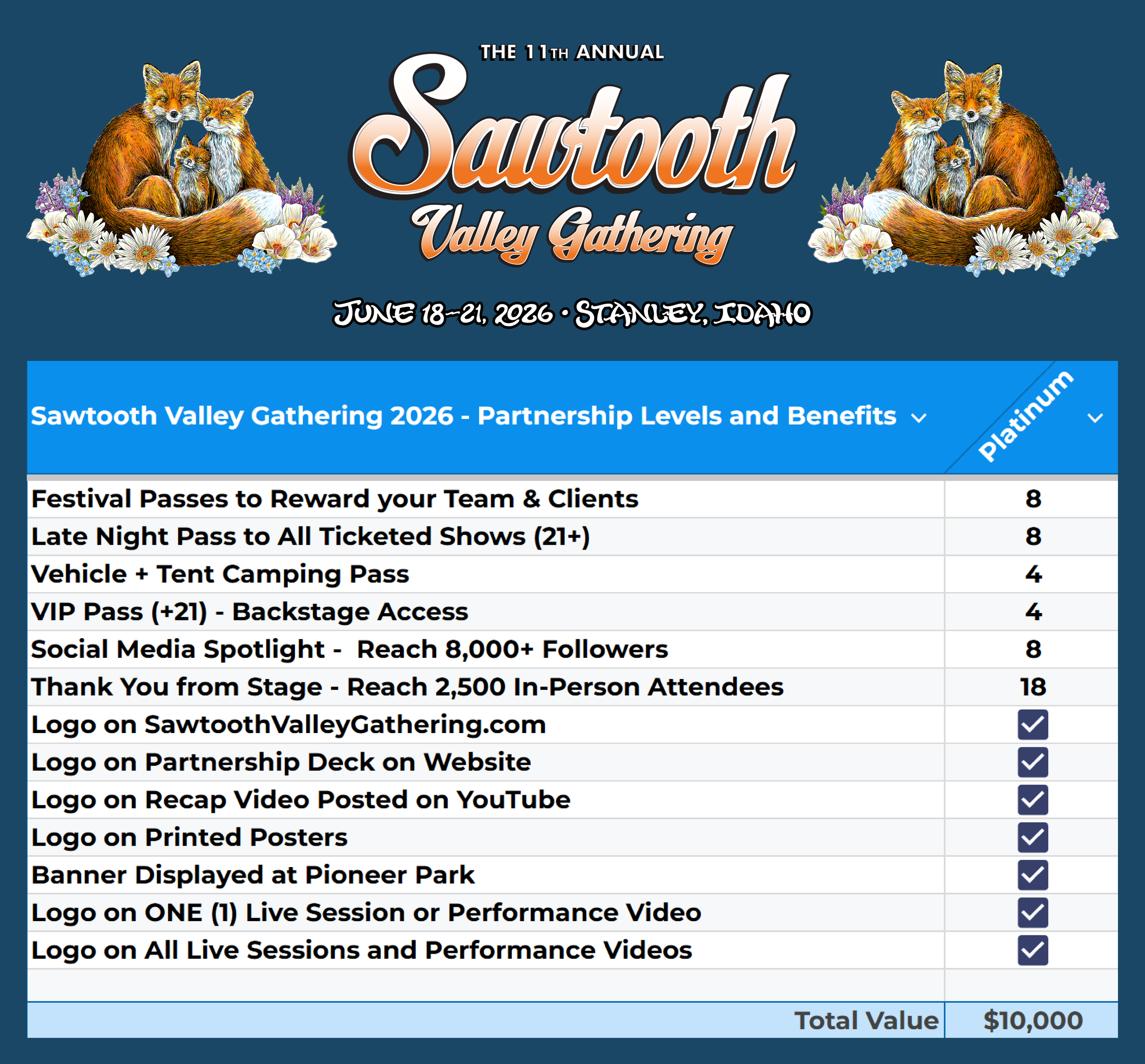 Hang your business banner on site at Pioneer Park to be seen all weekend by our 2,500 attendees. Banners will be visible in photos shared on our social media with one of the most picturesque backdrops in the world, the Sawtooth Mountains. We will say thank you to you from stage throughout the event.